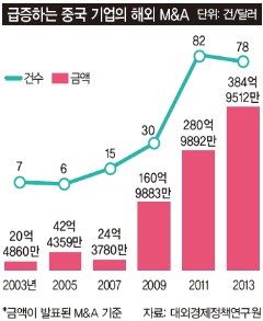 지난해 중국 기업의 M&A 규모는 약 385억 달러로 일본을 제치고 아시아 국가 1위에 올라섰다. 2000년대 후반까지만 해도 주로 에너지 분야 국영기업이 전면에 나섰다. 지난 15년 간 중국 에너지 관련 국영기업이 사들인 해외 자산은 1990억 달러(약 200조원)에 달하는데 전체 M&A 시장에서 에너지 관련 기업이 차지하는 비중은 2010년 30%에서 2012년 24%로 낮아지는 추세다.