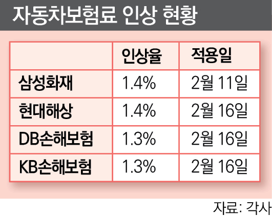 보험업계에 따르면 자동차보험 시장점유율 약 85%를 차지하는 ‘빅4’ 손보사(삼성화재·현대해상·DB손해보험·KB손해보험)들은 2월부터 일제히 보험료 조정에 나선다. 삼성화재는 2월 11일 책임개시 계약부터 보험료를 1.4% 인상하고, 현대해상은 2월 16일부터 1.4%, DB손해보험은 같은 날 1.3%, KB손해보험은 2월 18일부터 1.3% 인상률을 적용한다.