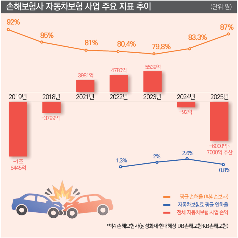 하지만 2021년부터 4년 연속 이어진 자동차보험료 인하와 함께 여러 원인들이 겹치며 2024년 손해율은 다시 83.3%로 급등했고 영업손익도 –97억원으로 적자 전환했다. 지난해 역시 손해율이 87%까지 치솟았고 영업손실이 최대 6000억~7000억원에 달할 것이란 전망이 나온다. 보험료 인하에 따른 손실을 손보사들이 더이상 버티지 못하게 된 셈이다.