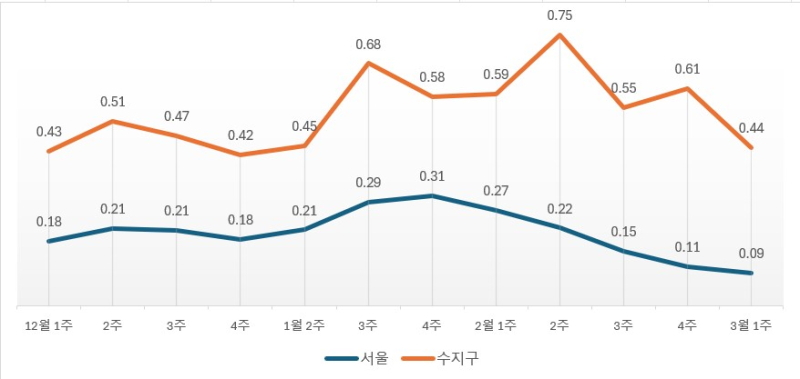 한국부동산원에 따르면 용인 수지 아파트값은 2월 넷째 주에만 0.61%, 3월 첫째 주에 0.44% 상승률을 기록했다. 용인 수지가 전국 최고 상승률을 기록한 건 이것으로 12주째다. 2월 말까지 누적 상승률은 4.72%에 달한다. 같은 기간 서울 강남구 누적 상승률(0.60%)의 7.9배에 달하며, 안양 동안구(3.30%)나 성남 분당구(3.06%)와 비교해도 압도적이다.