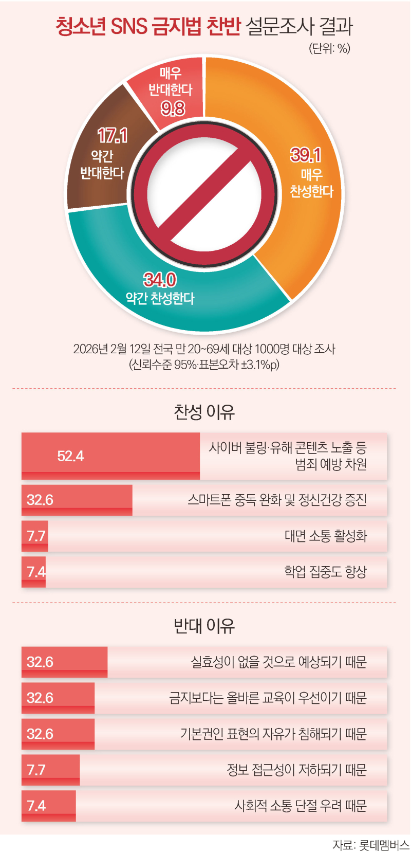 [이코노미스트]가 롯데멤버스 자체 리서치 플랫폼 라임(Lime)과 만 20∼69세 성인 1000명을 대상으로 실시한 설문조사에 따르면, 전체 응답자의 73.1%가 16세 미만 이용자의 SNS 접속을 차단하는 청소년 SNS 금지법에 찬성한다고 답했다. 반대 의견은 26.9%였다.